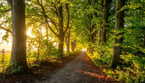 © ardi, Obraz premium Pathway framed by tall trees, sunlight streaming through branches