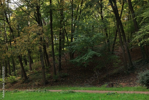 Naklejka premium Pathway, green grass and trees in beautiful public city park on autumn day