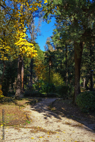 © Olga Iljinich, Fototapeta premium Pathway in park on sunny autumn day. Montenegro., Tivat city. View of Large Town Park