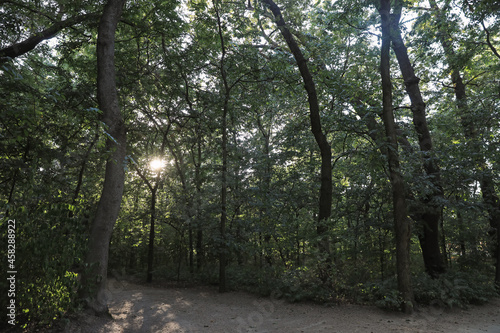 Fototapeta premium Pathway in park with green trees. Nature reserve