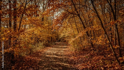 © AbstractAI, Obraz premium Pathway in woods layered with autumn leaves