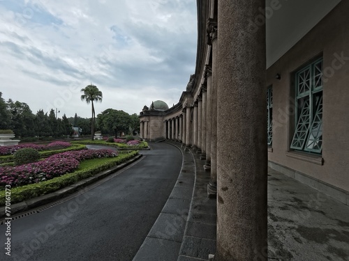 © dslr-user61, Obraz premium Pathway leading to a classical building with columns, surrounded by manicured gardens and lush greenery under a cloudy sky.