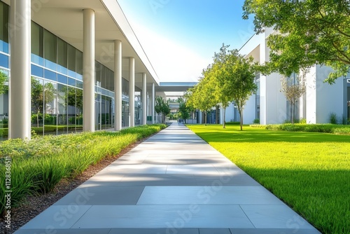 Naklejka premium Pathway lined with greenery leads through modern buildings in bright daylight