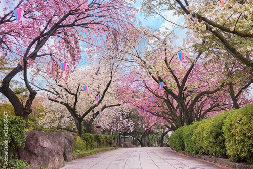 Obraz premium Pathway of the Asukayama park surrounded by pink and white cherry blossoms trees.