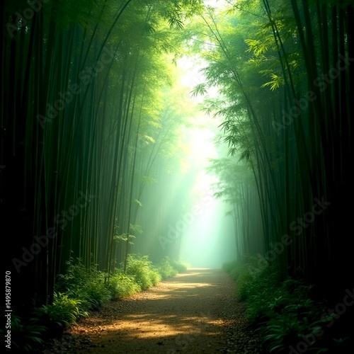 © MOHAMMAD, Obraz premium Pathway through a dense bamboo forest with light filtering through