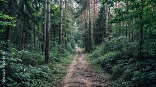Obraz premium Pathway through a dense green forest with tall trees