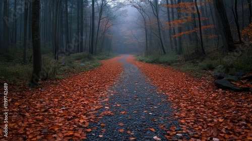 © Mazayshop, Obraz premium Pathway through a forest with fallen leaves in autumn - generated AI