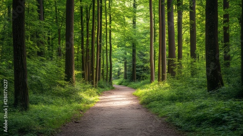 © earnjubu, Obraz premium Pathway through a lush green forest with tall trees peaceful woodland trail