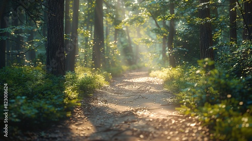 Obraz premium Pathway through a serene forest with dappled sunlight