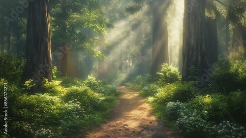 © kept, Obraz premium Pathway through dense forest with sunlight streaming through the trees.