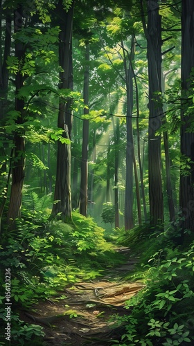 Obraz premium Pathway through lush green forest with sunlight filtering through trees,...