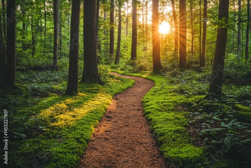 Fototapeta premium Pathway through lush green forest with sunlight shining through trees