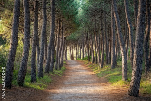 © kitipol, Fototapeta premium Pathway through pine forest park, inviting and serene for a stroll