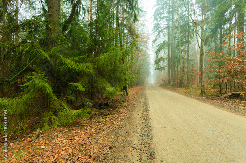 © Voyagerix, Obraz premium Pathway through the misty autumn forest