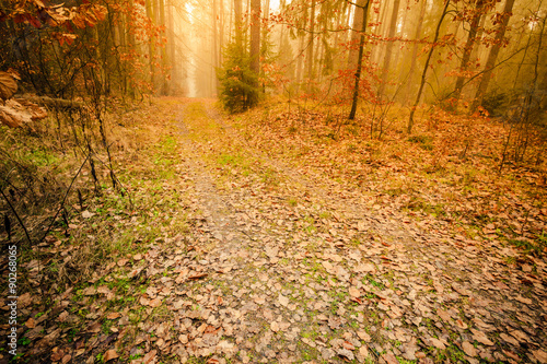 © Voyagerix, Obraz premium Pathway through the misty autumn forest
