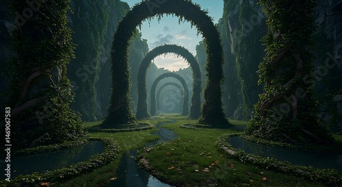 © Bujur Mujur, Obraz premium Pathway with Arches in Lush Green Garden Setting