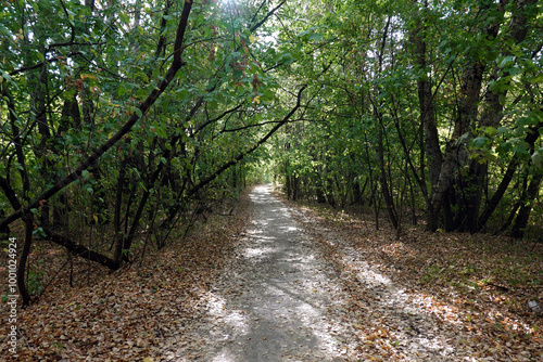 © DyMaxFoto, Fototapeta premium Pathway with with falled foliage around going deep far into autumn forest