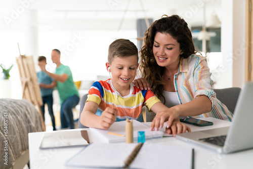 © Dorde, Fototapeta premium Patient and caring mother helping her son to finish his school work using laptop and tablet. They are writing it in the notebook while father and younger boy paint on canvas on an easel in background.
