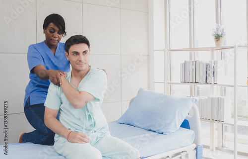 © Singh, Obraz premium Patient caucasian man with woman nurse black people carer physical therapist two person sitting talk helping support give advice and holding relax massage on back body in room service hospital clinic