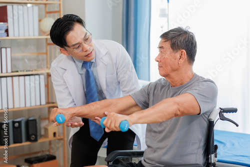 © Wanchai, Obraz premium Patient with weak arm muscles doing light dumbbell exercises during physical therapy to regain strength and support physical recovery.