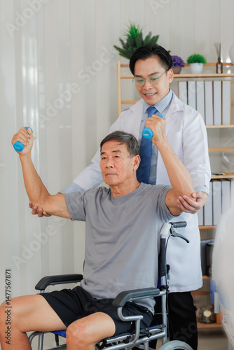 © Wanchai, Fototapeta premium Patient with weak arm muscles doing light dumbbell exercises during physical therapy to regain strength and support physical recovery.