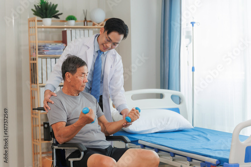 © Wanchai, Fototapeta premium Patient with weak arm muscles doing light dumbbell exercises during physical therapy to regain strength and support physical recovery.