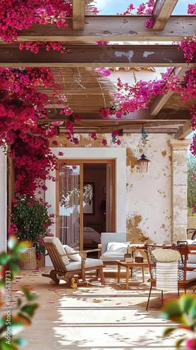Obraz premium Patio with Bougainvillea Vines and Rustic Chairs