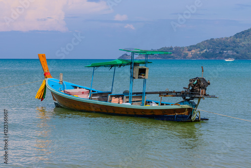 Fototapeta premium Patong Beach phuket Thailand beautiful turquoise blue waters on the white sand and long tail boats used for tourist
