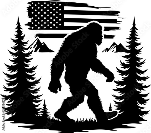 © Rupchad, Fototapeta premium Patriotic Bigfoot in the Wild - Forest Silhouette Design"
