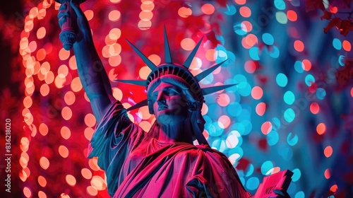 © amankris99, Fototapeta premium Patriotic Colors The statue against a background of red, white, and blue lights