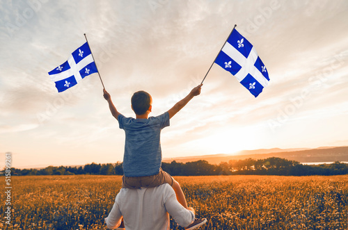 Obraz premium Patriotic father and child waving Quebec flags on sunset