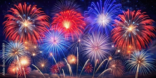 © Four888, Naklejka premium Patriotic Fireworks Extravaganza: Bold Red White Blue Sparks Explosion Night Sky