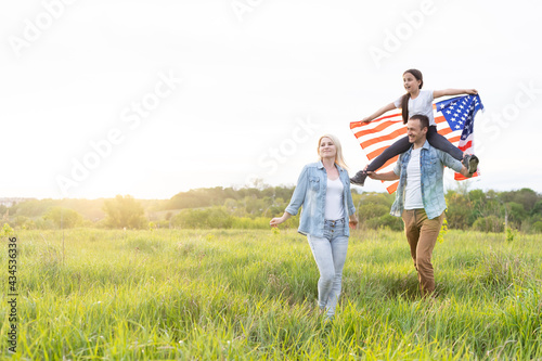 © Angelov, Fototapeta premium Patriotic holiday. Happy family, parents and daughters children girl with American flag outdoors. USA celebrate 4th of July.
