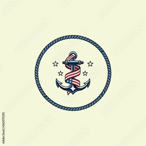 Fototapeta premium Patriotic naval anchor emblem with a stars and stripes banner in a circular...