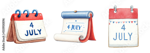 © Moonroad, Fototapeta premium Patriotic watercolor concept of July 4 calendar pages in red white and blue style