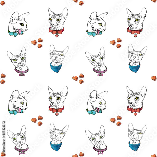 Fototapeta premium pattern drawing Sphinx cat's head in a butterfly collar on a white background...