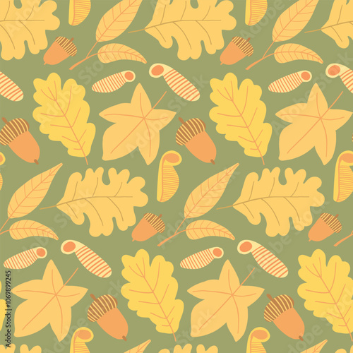 Fototapeta premium Pattern featuring yellow oak leaves and acorns, perfect for autumnal designs,...