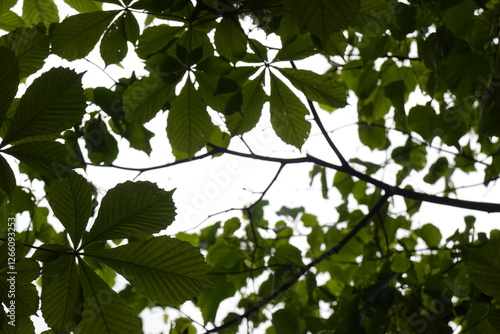 © Unedited Photos, Obraz premium Pattern - Horse chestnut, buckeye, conker tree leaves, leafage, foliage view looking from the ground, bottom up - 4 - Vilnius, May 2024