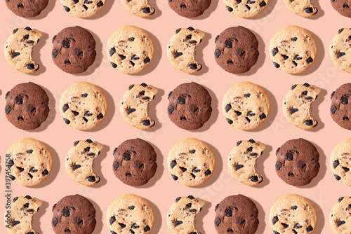 Obraz premium Pattern of chocolate chip cookies on a light brown background