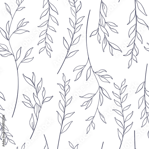 © Maryna, Naklejka premium Pattern of curved twigs. Delicate floral background in blue and white colors. Vector seamless pattern.