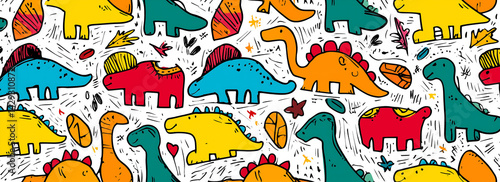 © Катерина Спіжевска, Obraz premium pattern of dinosaurs in a kid's doodle style