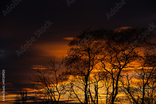 Fototapeta premium Pattern of dried tree braches texture against red sunset sky. Silhouette of...