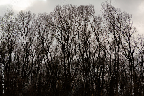Obraz premium Pattern of dried tree braches texture against white empty sky. Silhouette of...