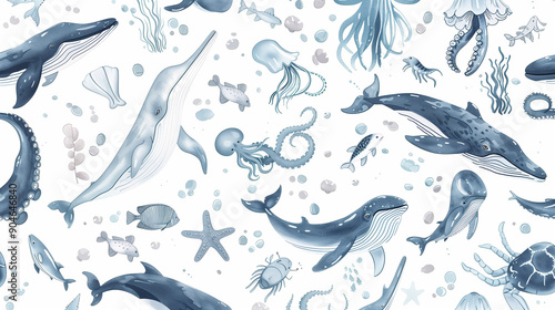Fototapeta premium Pattern of various marine life including whales, dolphins, and other sea...