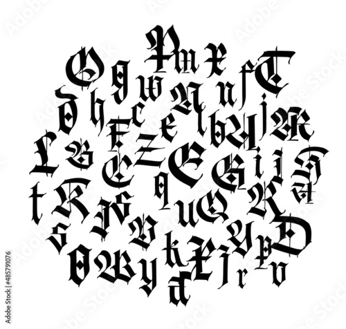 © ae, Naklejka premium Pattern, ornament in the Gothic style. Alphabet. Symbols are black on a white background. Calligraphy and lettering. Medieval Latin letters. Logo for the company. Set. Elegant font for tattoo.