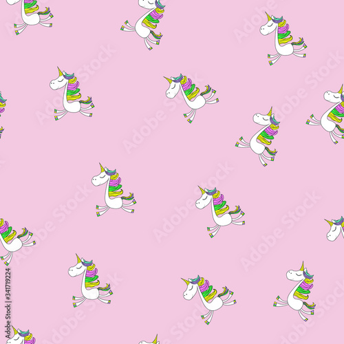 © Staisy Sanday, Fototapeta premium Pattern - sweet and cute unicorn ponies on kofeta pink background.
