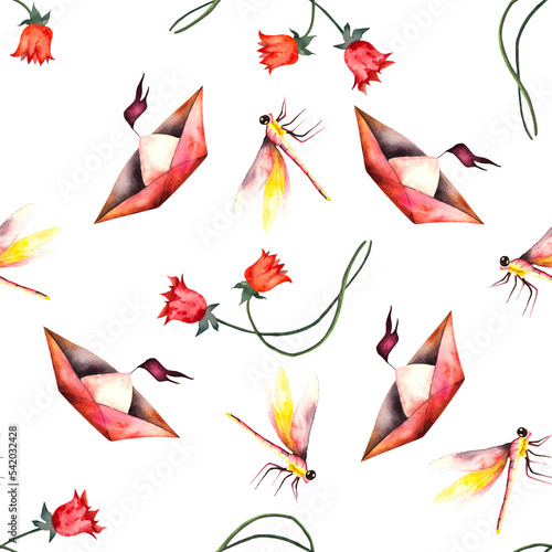 © Наталья Баранова, Obraz premium Pattern. Watercolor seamless pattern with spring flowers and ships