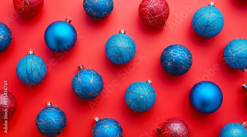 © Hanna, Fototapeta premium Pattern with blue Christmas decorations evenly spreaded on red background, top view.