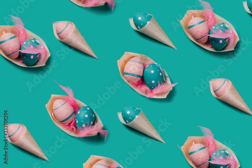 © Natalie, Naklejka premium Pattern with colored decorated eggs in bamboo cones look like ice cream and boat plates on green mint background. Concept of Easter, zero waste, ecology, copy space.