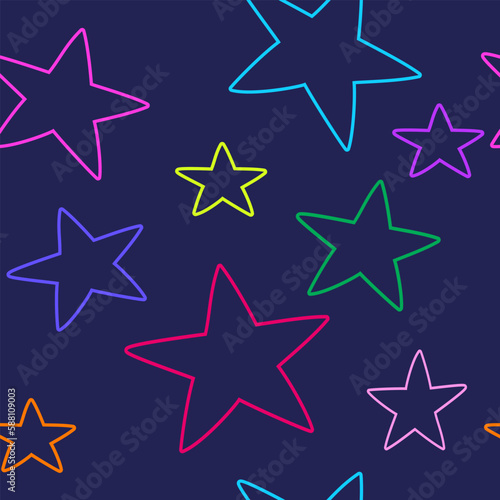 Fototapeta premium Pattern with colorful childrens doodle stars drawn on dark background